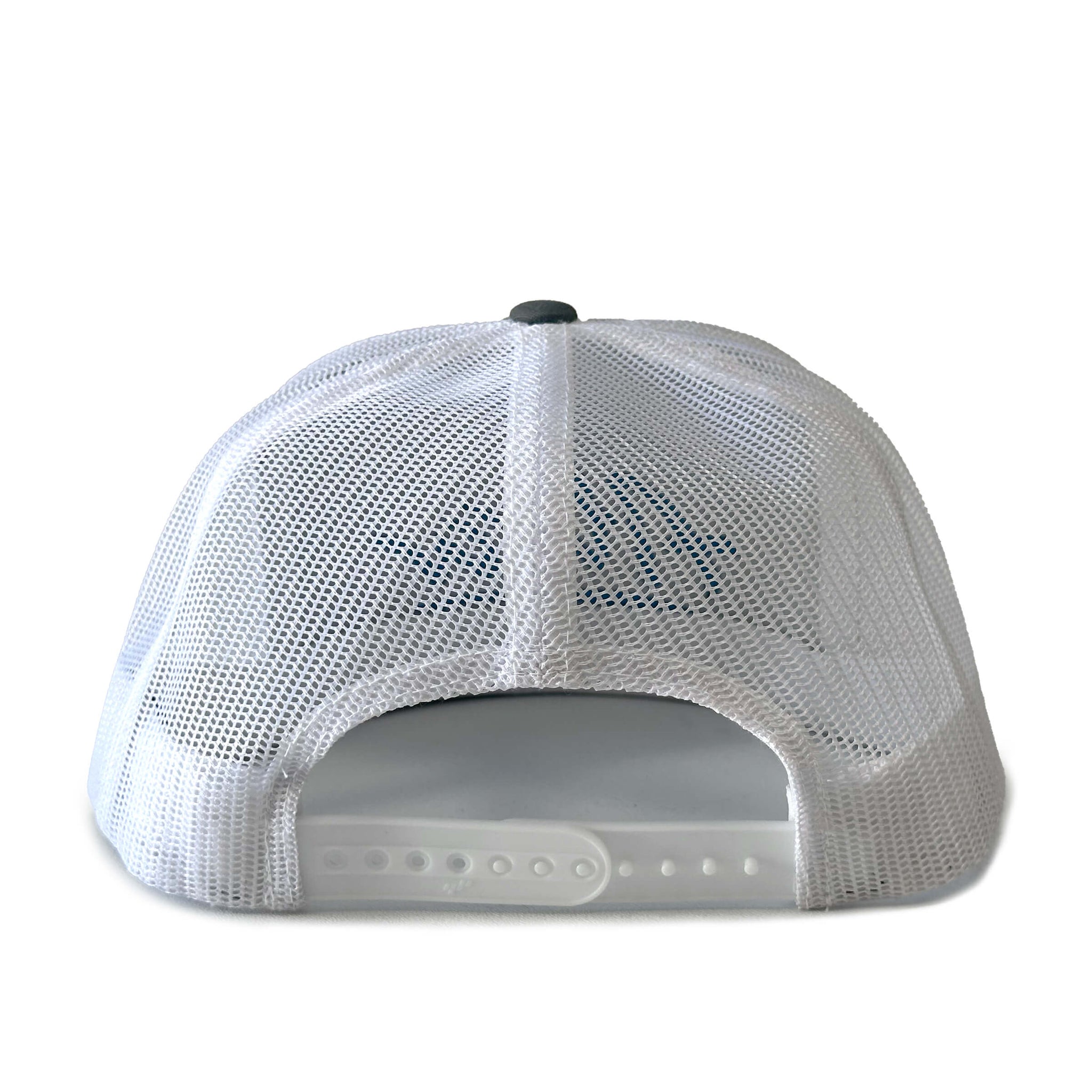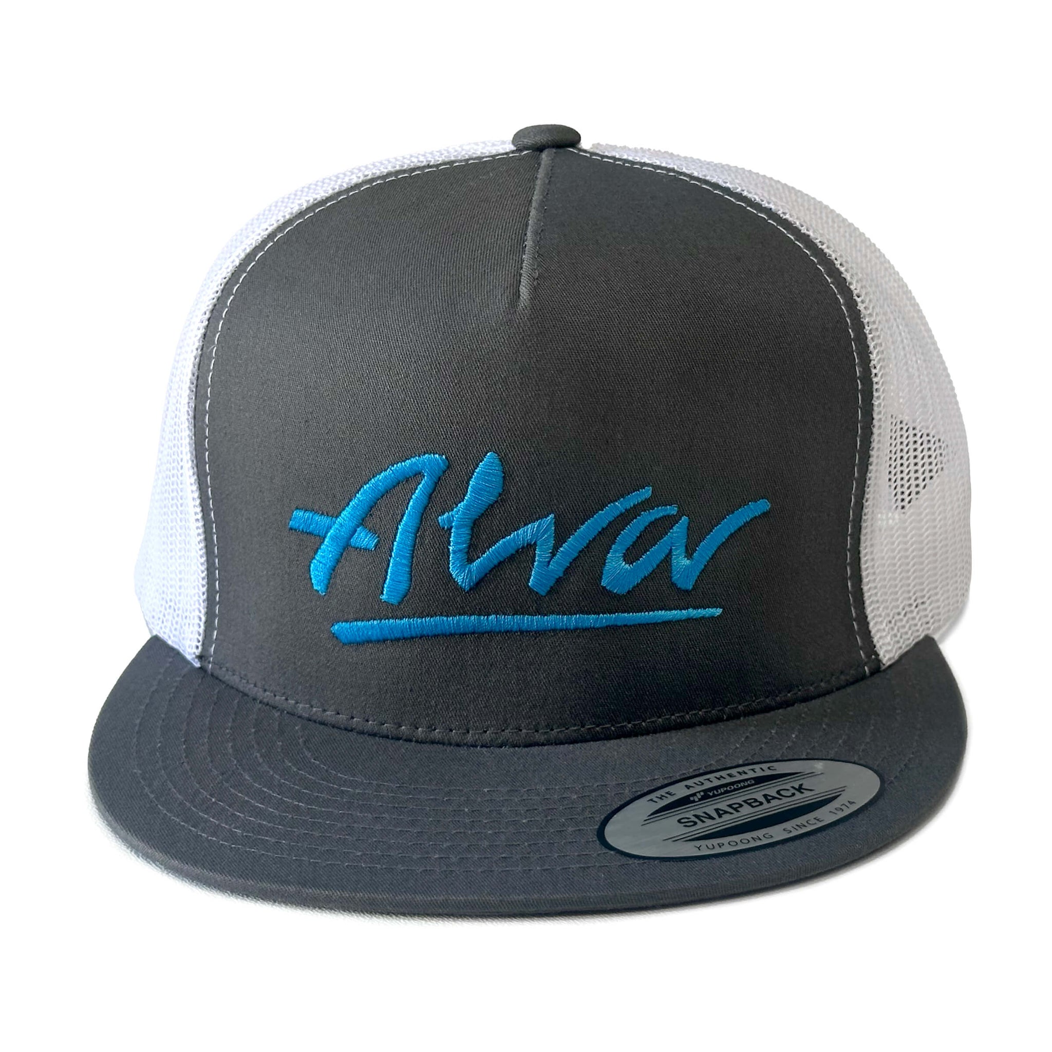 ALVA Grey and White MESH SNAP BACK HAT WITH Light Blue EMBROIDERED OG LOGO
